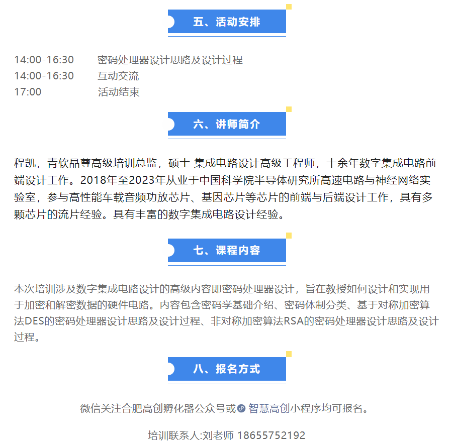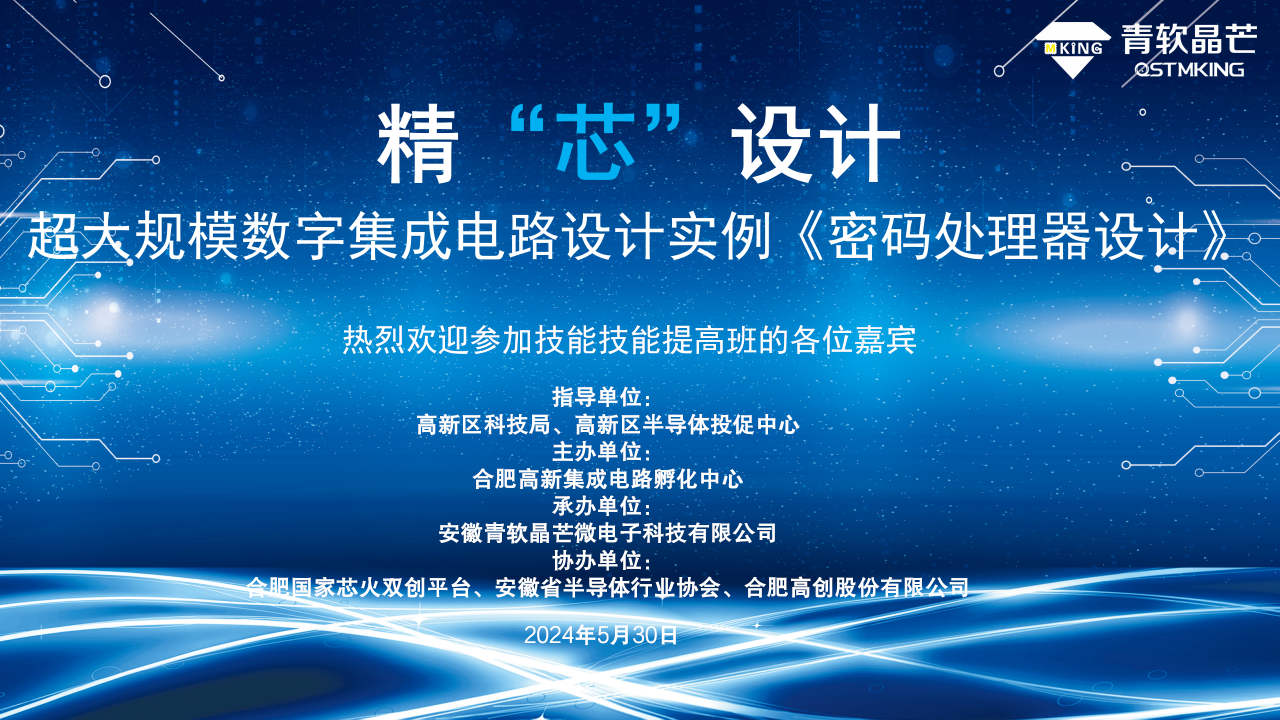 隨著集成電路行業(yè)的不斷進(jìn)步,專業(yè)知識的學(xué)習(xí)與提升對于企業(yè)發(fā)展至關(guān)重要。為了滿足園區(qū)企業(yè)的需求,我們計劃舉辦精芯設(shè)計--超大規(guī)模數(shù)字集成電路設(shè)計實(shí)例《密碼處理器設(shè)計》培訓(xùn)活動。本次培訓(xùn)將由經(jīng)驗(yàn)豐富的程凱老師主講,旨在提供專業(yè)技能和前沿知識的學(xué)習(xí)機(jī)會,幫助企業(yè)提升在行業(yè)內(nèi)的競爭力。